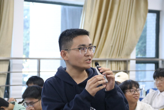 随后,优秀学生代表唐成亮学长分享了他的学习经验和竞赛心得。唐学长结合自身经历,详细介绍了如何科学规划时间、平衡学业与竞赛的关系,以及高效备赛的实用技巧。他特别提到,在备赛过程中要注重团队协作,善于利用学校提供的各类资源,并鼓励同学们要勇于尝试、敢于突破。这些建议让在场的班委们深受启发。